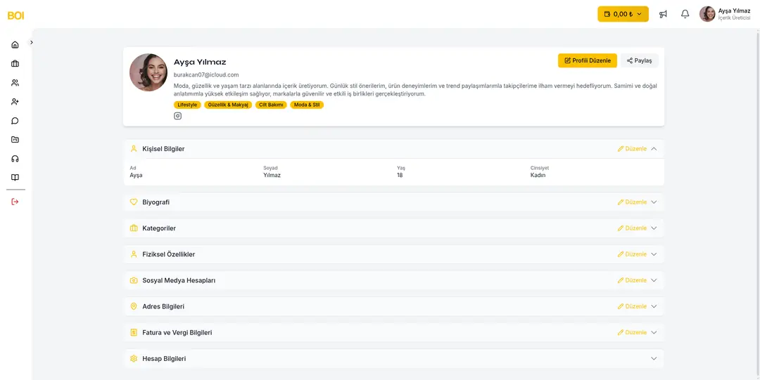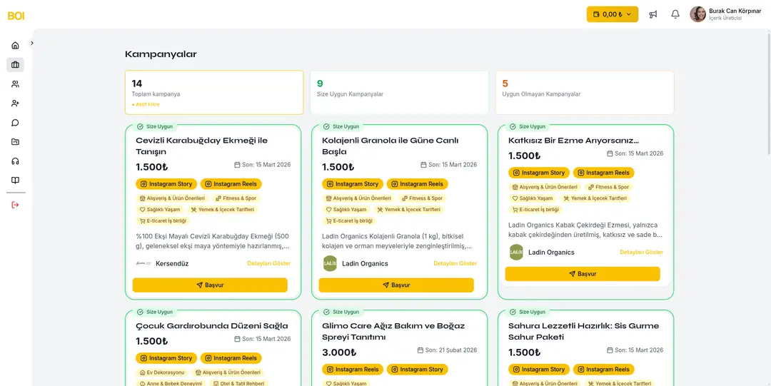 Base of Influencer, markalar ile influencer’ları ve içerik üreticilerini stratejik iş birlikleri için buluşturan güçlü bir marka ve içerik üreticisi eşleştirme platformudur. BOI sayesinde markalar kampanya brieflerini oluşturabilir, uygun içerik üreticilerini bulabilir ve tüm iş birliği sürecini tek panelden yönetebilirler. Platform, markaların hedef kitlelerine doğru kanallardan ulaşmasını sağlayarak dijital görünürlüğü ve etkiyi artırmayı amaçlar. BOI, iş birliği süreçlerini şeffaf, kullanıcı dostu ve verimli hale getirir; kampanya oluşturma, başvuru değerlendirme, içerik onayı ve performans takibini tek bir sistemde toplar. İçerik üreticiler ise kampanyalara kolayca başvuru yapabilir, markalarla doğrudan iletişim kurabilir ve içerik süreçlerini takip edebilir. Böylece hem markalar hem de içerik üreticileri için profesyonel, güvenli ve uçtan uca bir iş birliği deneyimi sunar.