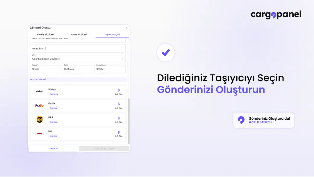 Aktarılan siparişler için taşıyıcılardan anında fiyat teklifi alabilir, tercih ettiğiniz servis ile gönderinizi kolayca oluşturabilirsiniz. cargopanel ile e-ihracat süreçlerinizi daha hızlı ve verimli şekilde yönetebilirsiniz.