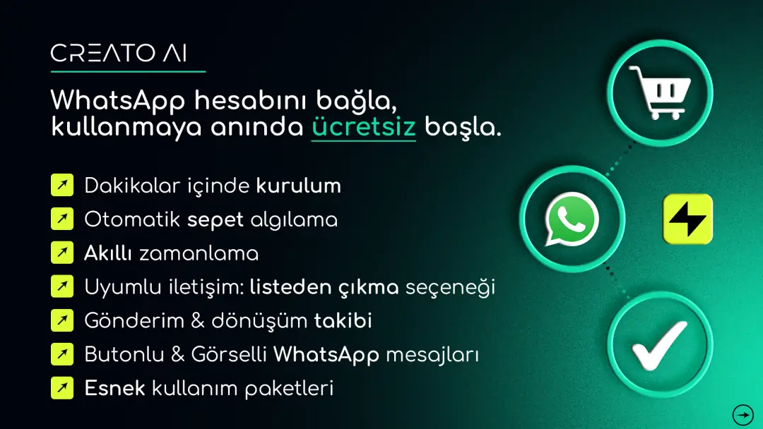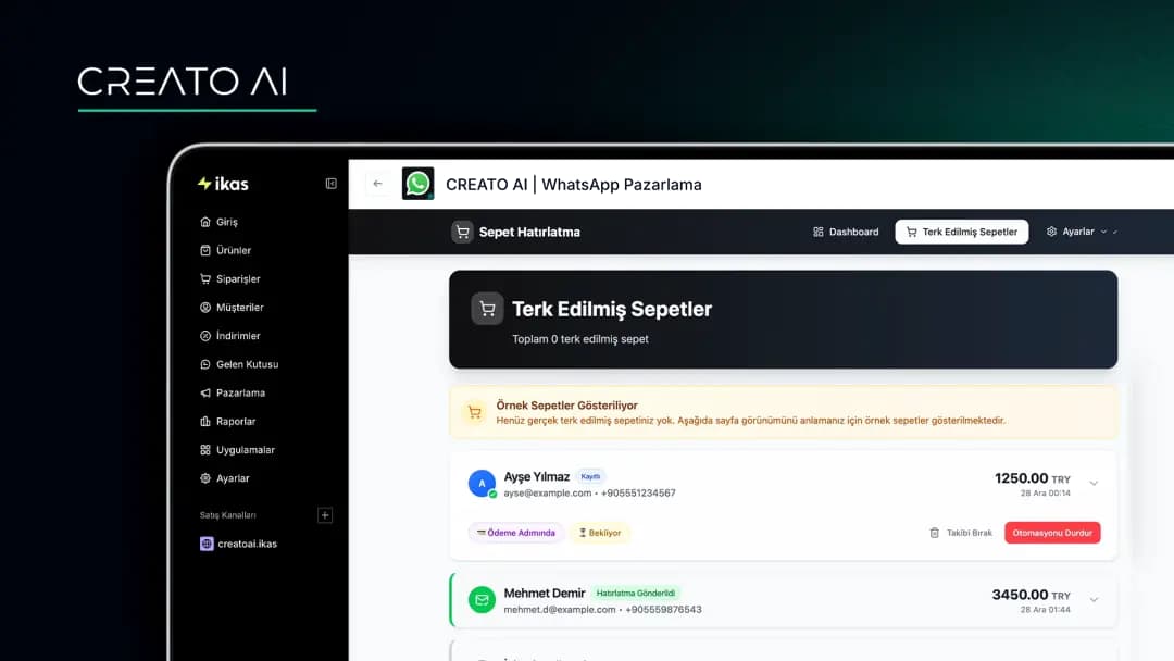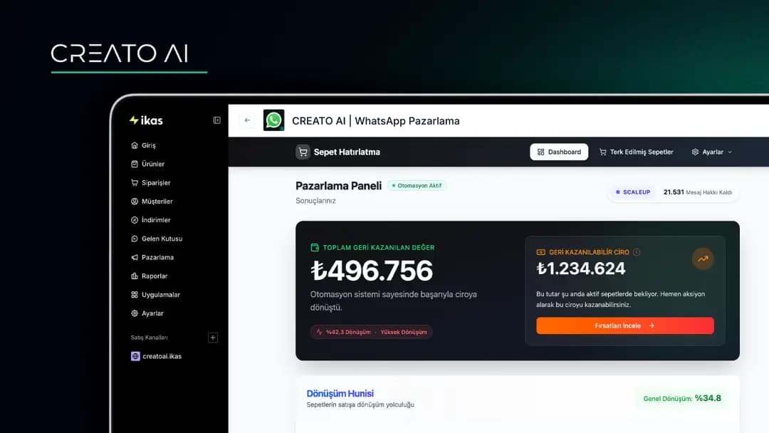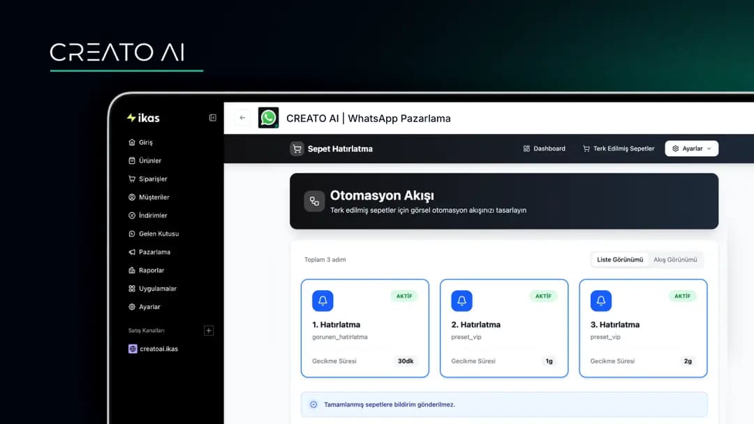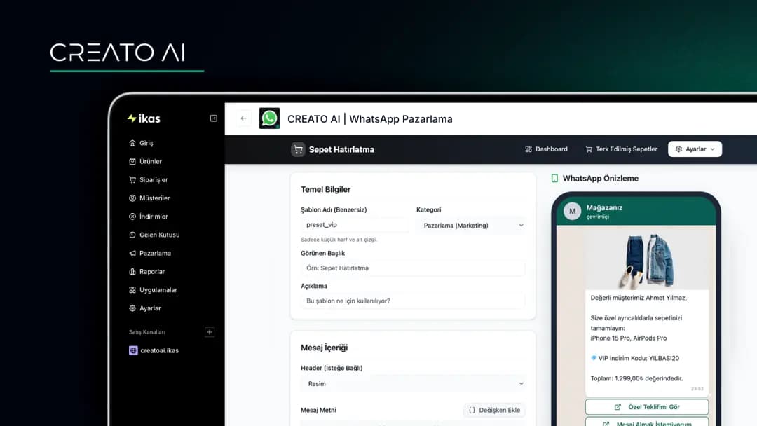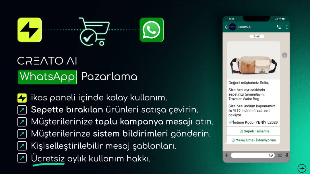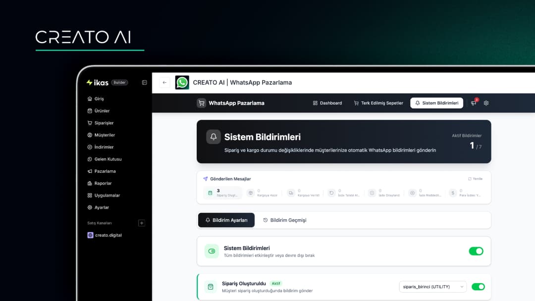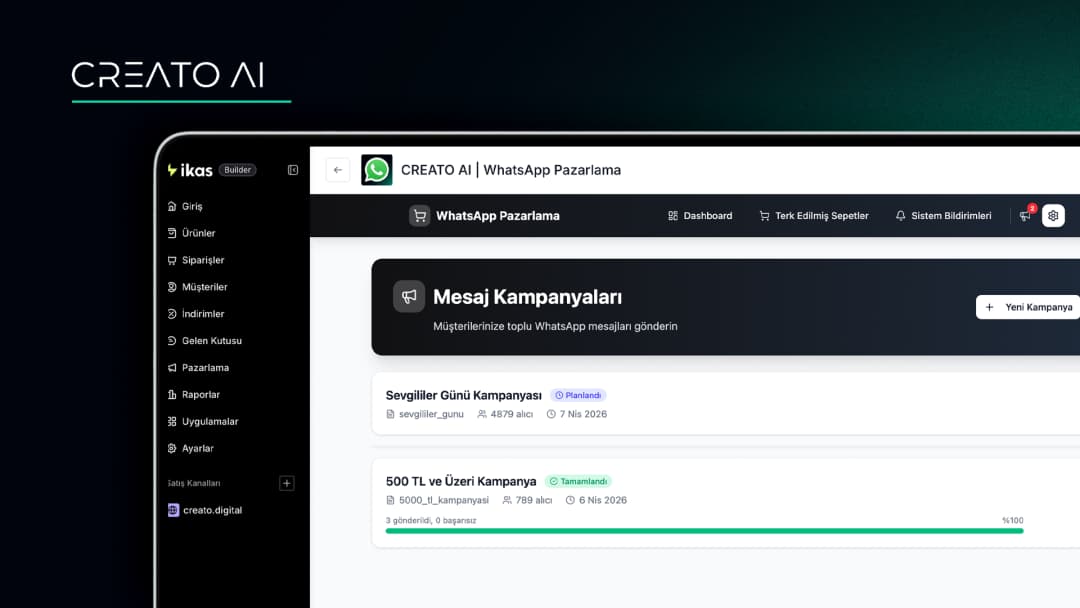 CREATO AI, ikas altyapısı kullanan mağazalar için geliştirilen gelişmiş bir WhatsApp iletişim ve otomasyon çözümüdür. Artık yalnızca terk edilen sepetleri hatırlatmakla kalmaz; aynı zamanda müşterilerinize toplu kampanya mesajları göndermenizi ve sipariş süreçlerine dair sistem bildirimlerini otomatik olarak iletmenizi sağlar.