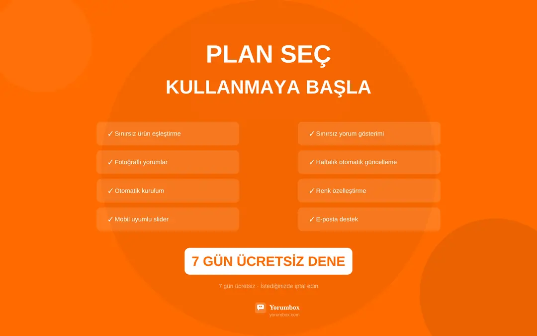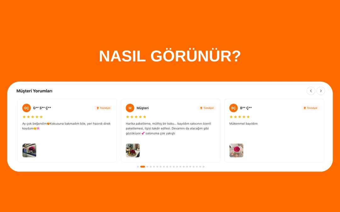 Trendyol entegrasyonu ile 2 dakikada kurulum, hızlı ürün eşleştirme, fotoğraflı yorum desteği, haftalık otomatik güncelleme, sınırsız renk ve görünüm özelleştirme, mobil uyumlu slider tasarım.