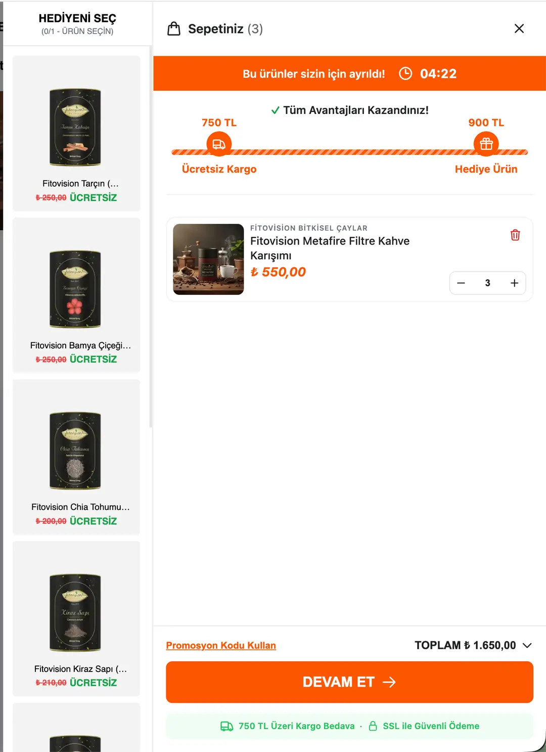 Sepet Zamanlayıcısı ile Aciliyet Hissi (FOMO): Sepet üstünde yer alan "Bu ürünler sizin için ayrıldı!" rezervasyon barı ve geri sayım sayacı sayesinde, kararsız müşterilerinizi hızlıca ödeme adımına geçmeye ikna edin