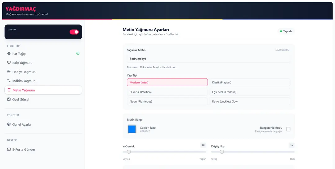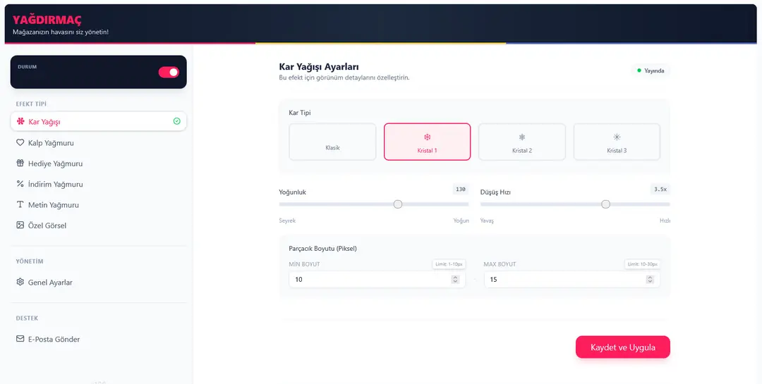 Müşterilerinizi şaşırtın, mutlu edin ve satışlarınızı artırın. Yılbaşı, Sevgililer Günü, Efsane Cuma veya markanıza özel kampanya dönemlerinde sitenize sadece bir "efekt" değil, özel bir atmosfer katabilirsiniz.