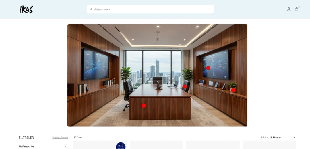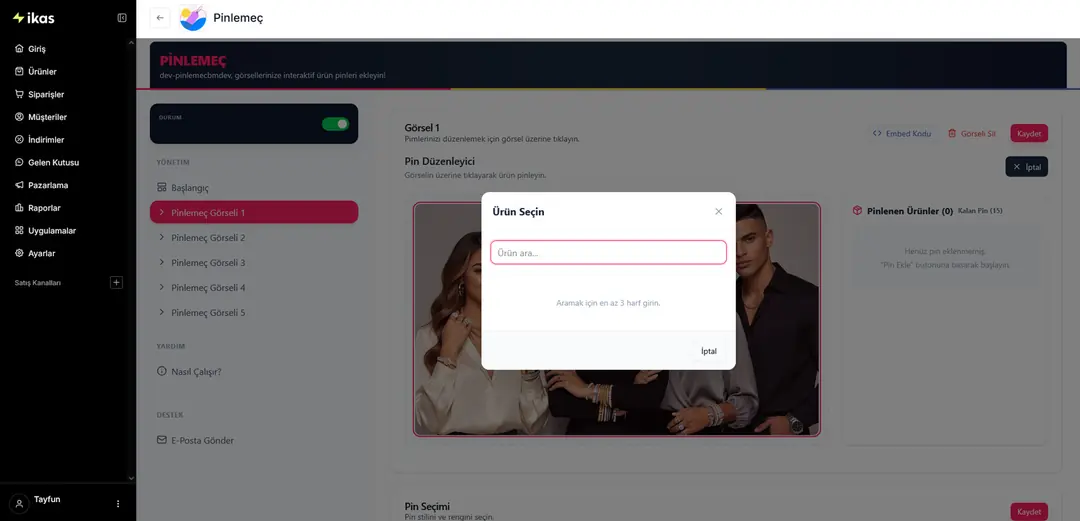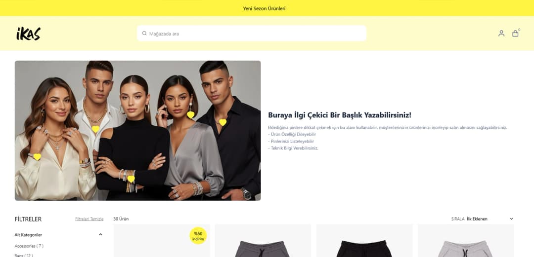 ikas e-ticaret sitenizde sadece fotoğraf göstermekle yetinmeyin; müşterilerinize görsellerin üzerinde gezinebilecekleri interaktif bir vitrin sunun! Pinlemeç, görsellerinizin üzerine şık ürün iğneleri (pinler) ekleyerek ziyaretçilerinizin ürün detaylarına anında ulaşmasını ve ürünü satın almasını sağlamaya yardımcı olur.